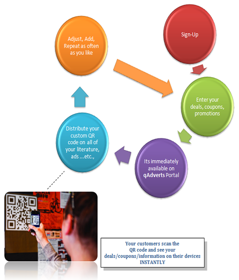 Why? As a small business often times you are very limited in your marketing and advertising dollars. As a result, whatever advertising you finally do, you want to make sure you can maximize. qAdverts™ platform is a solution to maximize your advertising dollars by making static and boring ads come alive. How? By simply adding your own custom QR code as generated by the qAdverts™ platform, to your ad, you immediately bring mobile users to your deals, promotions, announcements and events. In addition, they have instant access to your business contact information and maps. You are limited only by your imagination and you can change anything at any time. Once you sign up to the qAdverts™ platform, you can immediately start populating the system with your deals, coupons, promotions, specials or anything else you like. Customers get to the qAdverts™ portal through various ways, such as the QR code, direct links, promotional email and weekly reminder emails. As long as your QR code is there, your customers will get to you. The Portal can be seen on a regular computer, or on ANY smartphone device, ready to be used at the time of purchase!
